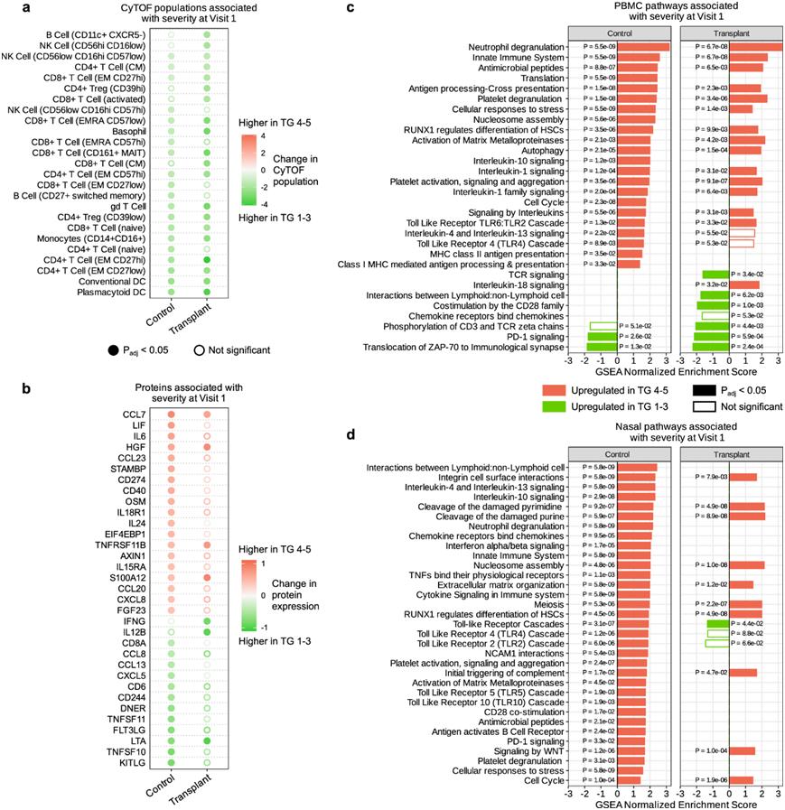 (a) 重症患者(TG 4-5,红色)与轻度/中度患者(TG 1-3,绿色)相比,在对照组和移植组中上调或下调的免疫细胞群的点图。(b) 重症患者与轻度/中度患者相比,在对照组和移植组中上调或下调的蛋白质的点图。(c) 图表突出显示了通过基因集富集分析(GSEA)从外周血单核细胞(PBMC)转录组学中确定的信号通路。(d) 突出显示了鼻转录组中 GSEA 识别的信号通路。