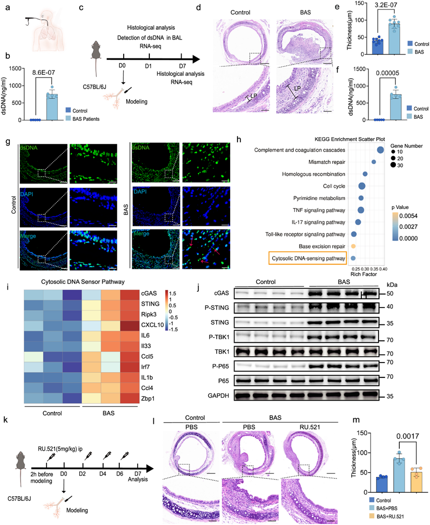 (a) 患者气管灌洗示意图。(b) 对照组和 BAS 患者组气管灌洗液中 dsDNA 的定量分析。(c) 描述良性气道狭窄小鼠实验策略的示意图。(d) H &E 染色显示第 7 天对照组和 BAS 小鼠气管内和 LP 状况。(e) 对照组和 BAS 组LP 厚度的定量分析。(f) 定量检测对照组和 BAS 组(每组 n = 5 只小鼠)小鼠气管灌洗液中的 dsDNA。(g) BAS组和对照组 dsDNA(绿色)的代表性气管免疫荧光图像。(h)KEGG分析。(i) 热图显示与对照组(每组 3 只小鼠)相比,BAS 组上调了参与细胞浆 DNA 传感器途径的基因。(j)免疫印迹分析。(k) 小鼠服用 Ru.521(5 mg/kg,腹腔注射)的示意图。(l) H & E 染色显示第 7 天对照组和 BAS 小鼠的气管内和 LP 状况。(m) 定量分析表明,与用 PBS 处理的 BAS 组相比,用 Ru.521 处理的 BAS 组的固有层厚度减少。