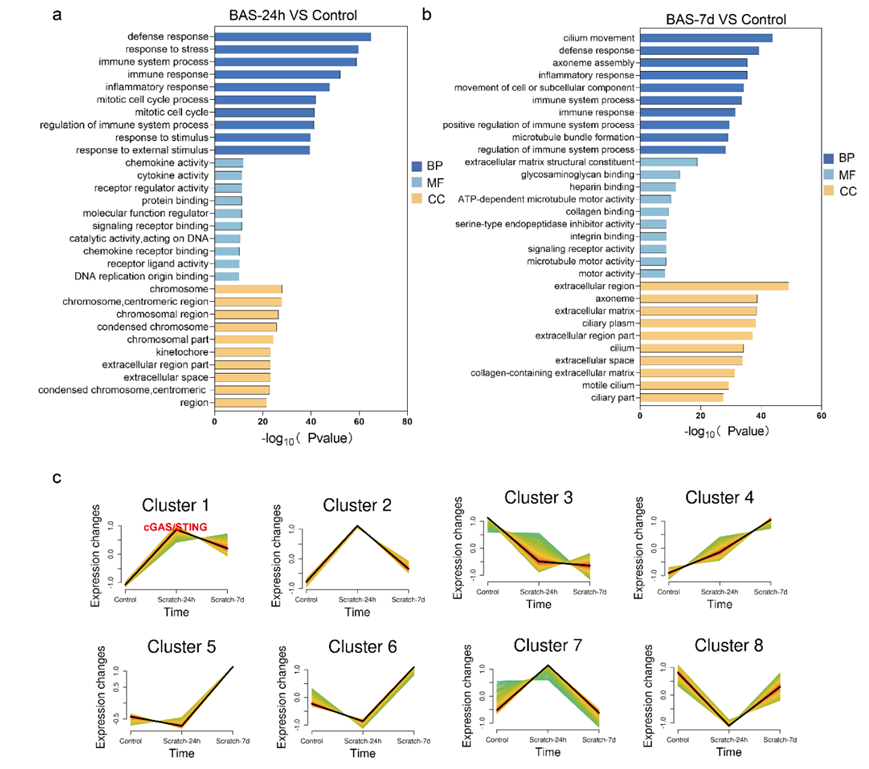 (a-b)GO分析。(c) 气管损伤后24h和7d良性气道狭窄小鼠的Mfuzz时间序列分析。