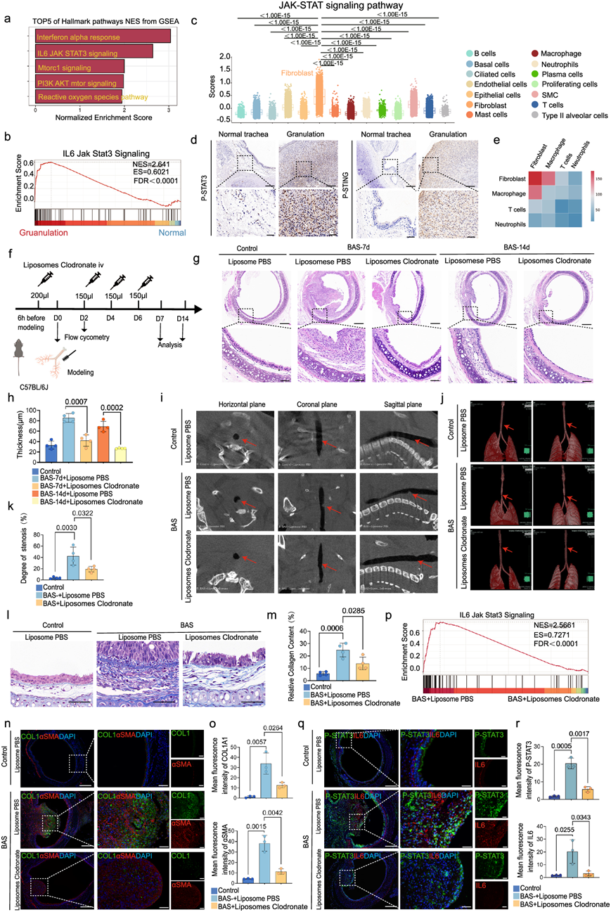 (a) GSEA 分析显示与正常组相比,颗粒化组中 TOP5 标志性通路富集。(b) GSEA分析显示,颗粒化组中 IL6 jak STAT3 通路富集。(c) 箱线图显示正常组和肉芽组织组所有聚类中的JAK-STAT 通路评分。(d) P-STAT3 和 P-STING 免疫组织化学染色的代表性图像。(e) 热图显示了巨噬细胞、T 细胞、中性粒细胞和成纤维细胞之间的配体-受体相互作用。(f) 小鼠服用氯膦酸盐脂质体的示意图。(g) 第7 天和第 14 天不同组 H&E 染色的代表性图像。(h) 不同组 LP 厚度的定量分析。(i) 不同组的水平、冠状面和矢状面的微型 CT 扫描。(j) SYNPASE小鼠气管的 3D 重建。(k) 各组(每组4只小鼠)面积定量分析。(l) 各组Masson染色代表性图像。(m) 各组(每组4只小鼠)胶原面积 定量分析。(n-o) 代表性气管免疫荧光图像及αSMA(红色)和COL1(绿色)平均荧光强度 。(p) GSEA分析显示BAS +PBS组IL6 jak STAT3通路富集。(q-r) 不同组的代表性气管免疫荧光图像和 P-STAT3(绿色)和 IL6(红色)的平均荧光强度。