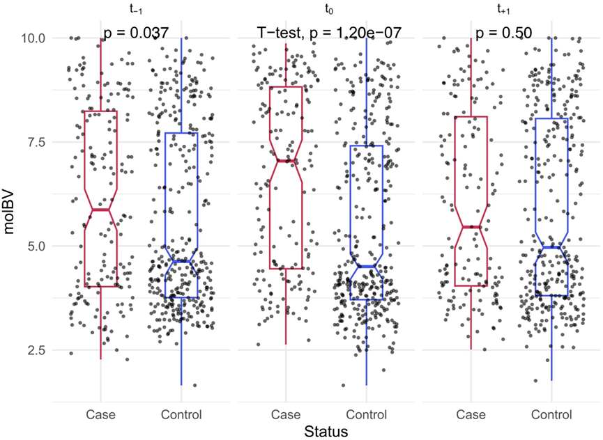 图2. CT 检测前、发生时和之后molBV评分的分布。