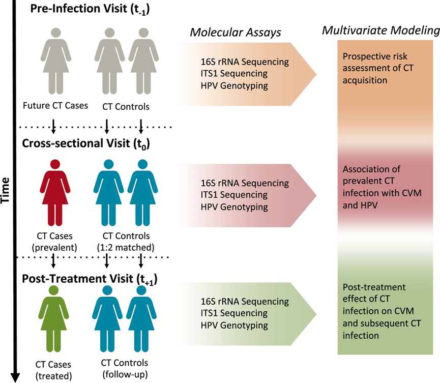 研究团队在一个大型临床社区开放动态队列研究中,采用嵌套病例对照设计,使用与年龄和 CT 病史相匹配的风险集抽样。为了研究宫颈阴道微生物群 (CVM)和 CT 之间的时间关联,他们收集了在 CT 感染(病例女性)前约 6 个月(t −1)、感染时(t 0)和治疗后 6 个月(t +1)的宫颈阴道样本并进行了16S rRNA 测序和ITS1 测序(图1)。