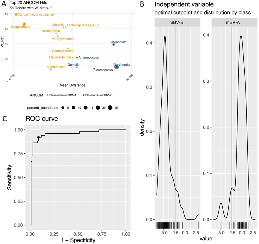 (A) 在 mBV-A 组和 mBV-B 组之间确定的差异丰度最高的 20 个属。(B) Ca. Lachnocurva vaginae的分布。(C) 使用Ca. Lachnocurva vaginae进行接收者操作特性 (ROC) 分析以识别 mBV-A 与 mBV-B。