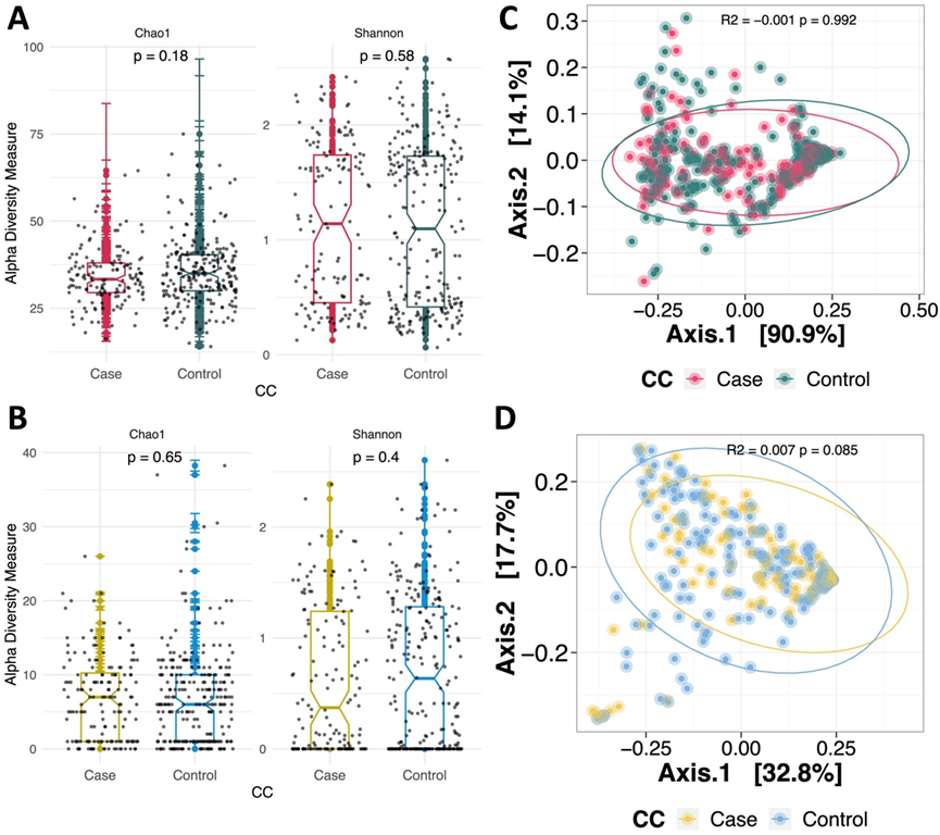 无论是基于分类单元数量(Chao1,p = 0.046)还是考虑到均匀度(Shannon,p = 2.50 × 10 −7 ),CT 病例中的CVM 细菌 α 多样性都更高(图 4 A)。真菌 α 多样性与 CT 病例状态无关(图 4 B)。同样,细菌分析显示,以 β 多样性和 CT 病例状态衡量的组成存在差异(图 4 C),而真菌分析则没有差异(图 4 D)。