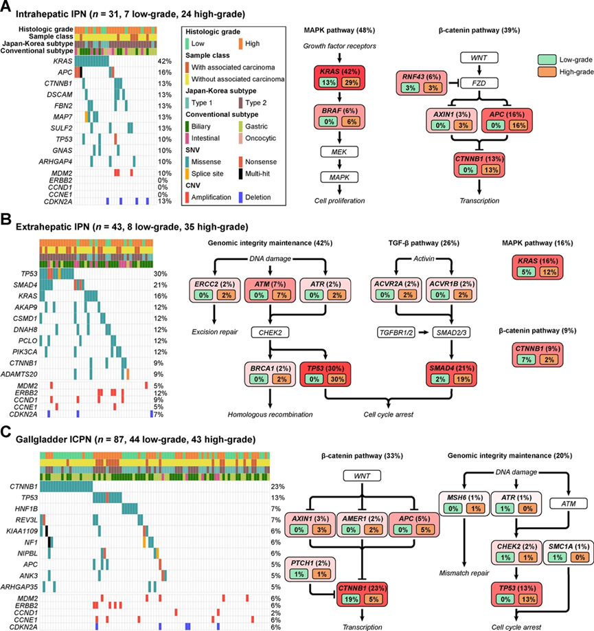 (A-C) 肝内 IPN、肝外 IPN 和ICPN 胆道癌中十大突变基因和五个拷贝数经常改变的基因。每个切片的右侧显示了显著突变的通路和组成基因的频率,分别显示低级别和高级别病变。每个框中的红色强度代表相对突变频率;白色框中的基因没有突变。
