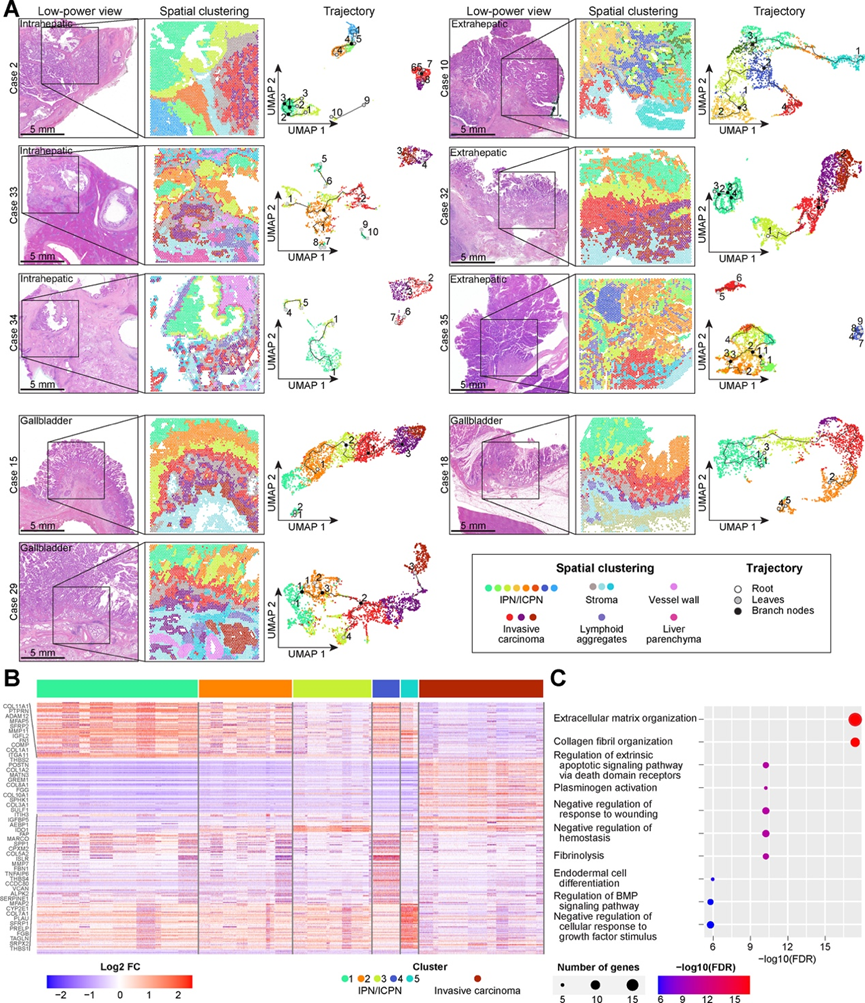 (A) Visium 空间转录组学结果。 (B) 从组合聚类中确定的每个 IPN/ICPN 或浸润性癌聚类的前 50 个差异表达基因的热图。(C)GO分析。