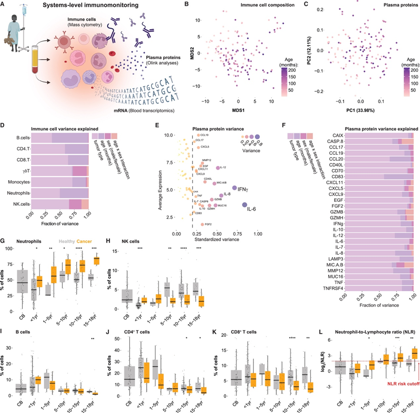 (A) 通过质谱流式细胞分析全血免疫细胞,用 Olink 检测法定量血浆蛋白,并研究转录组。(B) 基于n = 104 个免疫细胞群体,通过质谱流式细胞分析n = 140 个样本的多维尺度 (MDS) 图 ,并按基线采样时的年龄着色。(C) 通过 Olink 检测 77 种血浆蛋白,对n = 138 个样本进行主成分分析 (PCA)。(D) 通过质谱流式细胞检测的免疫细胞频率的变化。(E) 通过 Olink 检测测量的血浆蛋白的平均表达值与标准化方差。(F) 变化最大的蛋白质。(G) 对来自不同队列的n = 297 名健康儿童和ISAC 中的n = 140 名患者的全血细胞进行质谱流式细胞分析。(H-K)免疫细胞的相对频率。(L) 中性粒细胞与淋巴细胞比率 (NLR)。
