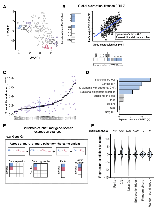 (A)UMAP可视化。(B) 计算来自同一患者的两个样本之间转录距离的示意图。(C) 60例TRACERx患者的原发肿瘤I-TED值。(D) 在包含至少2个样本原发肿瘤区域的60个肿瘤的I-TED值的多元线性模型上,通过9个选择的基因组和临床特征解释TRACERx队列中原发肿瘤I-TED评分的变异比例。(E) 线性回归框架的示意图,用于确定14120个基因中每个基因的患者内表达变化的相关性,包括基因剂量增加/减少和纯度变化的顺式效应。(F) 线性混合效应模型的回归系数分布适用于14120个基因中的每一个和模型中包括的每一个变量,基因总数与顶部突出显示的一个变量显著相关(FDR < 0.05)。