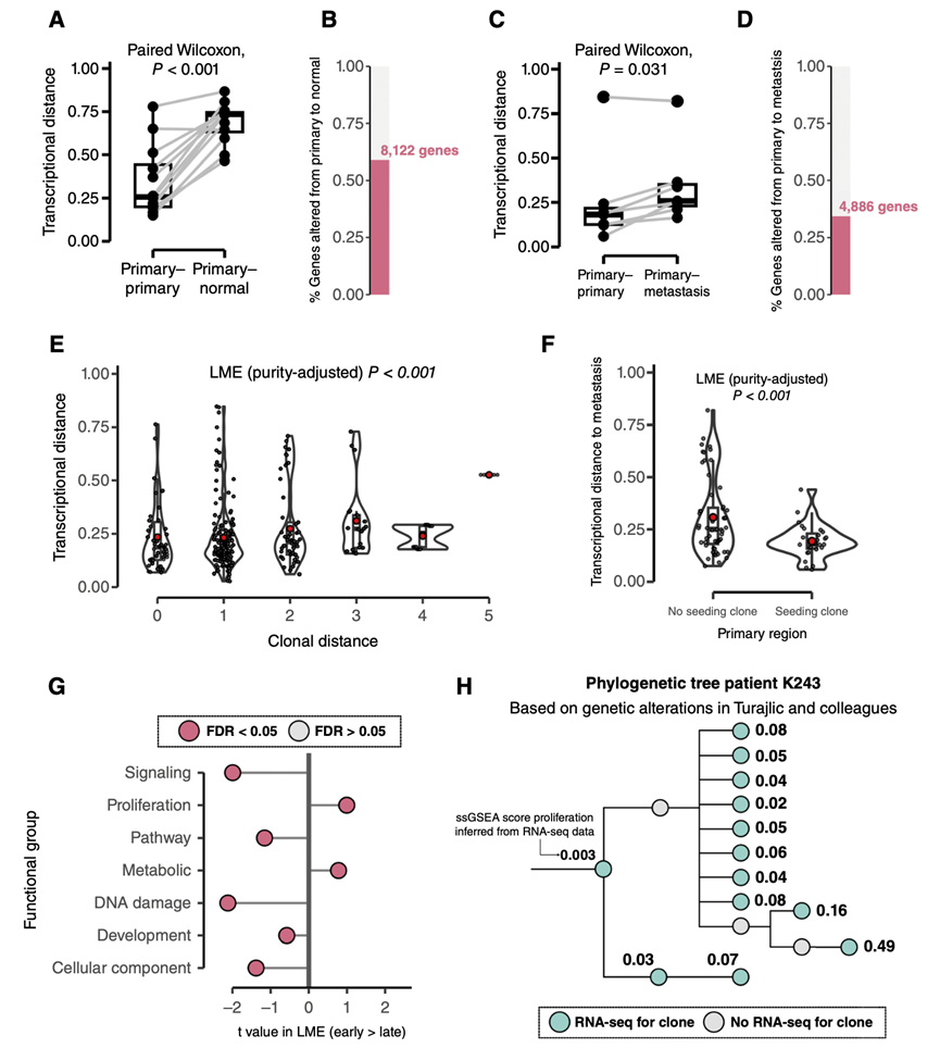 (A) 原发肿瘤样本与其他原发肿瘤样本或邻近正常肾样本之间的转录距离。(B) 使用基因特异性线性回归框架,正常原发性对中与表达变化显著相关的基因比例。(C) 原发肿瘤样本与其他原发肿瘤样本或匹配转移瘤之间的转录距离。(D) 使用基因特异性线性回归框架,与原发转移对中表达变化显著相关的基因比例。(E) 285对原发肿瘤样本之间的转录距离随着克隆距离的增加而增加,定义为位于两个不同单克隆区域的克隆之间的距离。(F) 转移样本和配对原发样本之间的转录距离取决于原发区域是否包含种子克隆。(G) 克隆基因表达的关联。(H) 患者k243的系统发育树。