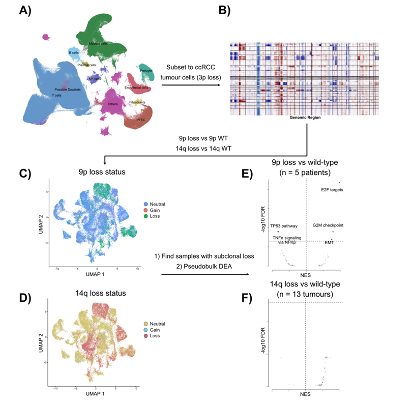 (A)UMAP可视化。(B) InferCNV确定了一群基于3p缺失的病理鉴定的ccRCC肿瘤细胞。(C-D)UMAP可视化。(E-F) 对野生型细胞的9p缺失或野生型细胞的14q缺失进行假体差异表达分析,在50个MSigDB标志特征上进行的基因集富集分析(GSEA)的火山图结果。