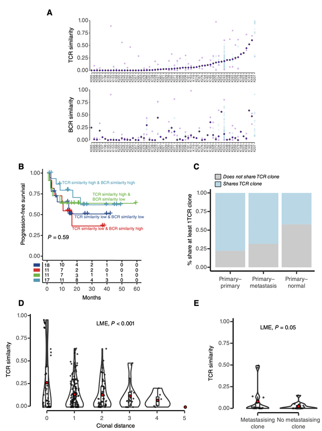 (A) TCR和BCR的相似性对60例TRACERx队列患者至少两个区域的采样。(B)生存分析。(C)TCR克隆分析。(D) 285对原发肿瘤样本的TCR相似性随着克隆距离的增加而增加,定义为两样本中各克隆之间的距离。(E) 转移样本和配对原发样本之间的TCR相似性取决于原发区域是否包含转移克隆。