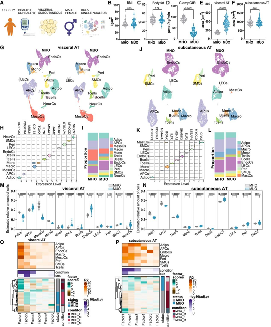 (A) 队列设计和实验计划。(B-F) BMI、体脂、正常血糖、高胰岛素钳制葡萄糖输注率 (ClampGIR)、脏、以及MHO和 MUO个体之间的皮下 AT 面积分布。(G)UMAP可视化。(H) 小提琴图显示内脏 AT 细胞聚类的选定标记基因表达。(I) 条形图显示患有 MHO 和 MUO 的个体的内脏 AT 中的相对细胞类型比例。(J) 19186 个细胞核的 UMAP,代表 36 名具有 MHO 和 MUO 的个体的皮下 AT,按广泛细胞类型着色。(K) 小提琴图显示皮下 AT 细胞聚类的选定标记基因表达。(L) 条形图显示 MHO 和 MUO 患者皮下 AT 中的相对细胞类型比例。(M-N) 小提琴图显示了基于 snRNA-seq确定的标记基因。(O-P) 内脏 AT和皮下 AT的多细胞因子分析。