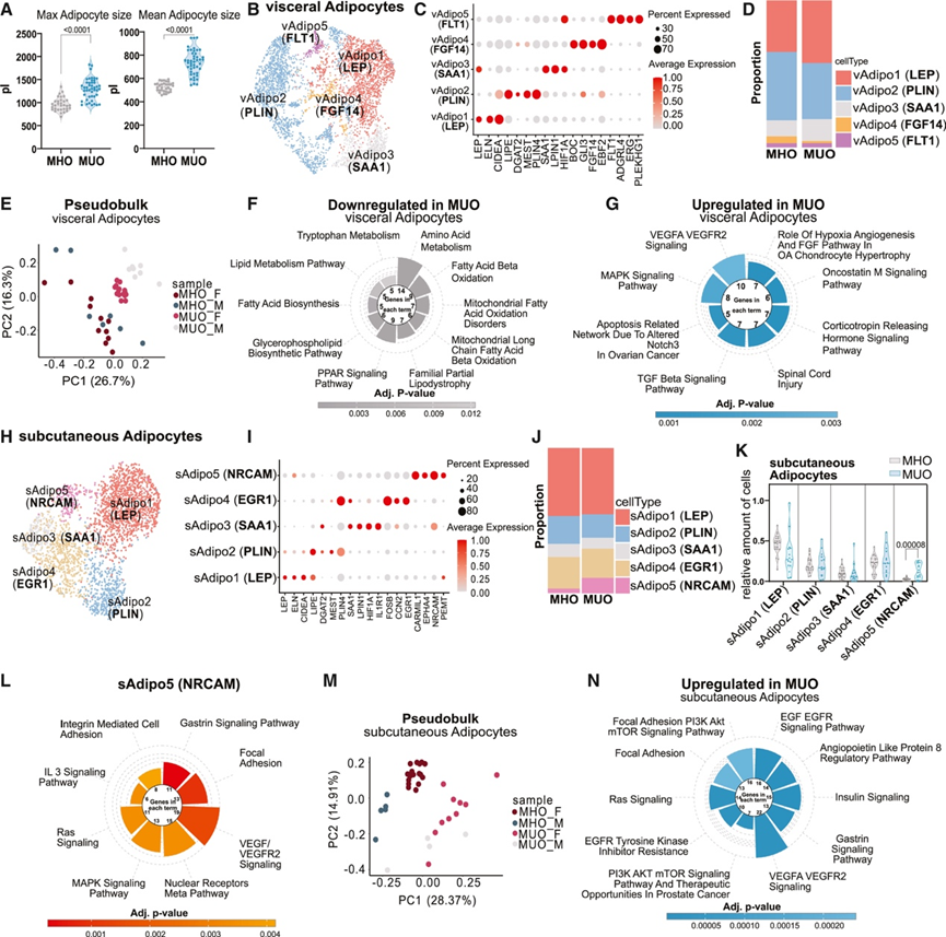 (A) MHO 和 MUO 患者的最大和平均内脏脂肪细胞尺寸分布。(B) 4375 个细胞核的 UMAP,代表患有 MHO 和 MUO 的个体的内脏脂肪细胞。(C) 点图显示用于注释内脏脂肪细胞亚群的标记基因的表达。(D) 条形图显示 MHO 和 MUO 中内脏脂肪细胞亚群的相对比例。(E) 来自 SNP 解复用个体的PCA 显示 MHO 和 MUO 之间的内脏脂肪细胞聚类形成,按性别划分。(F-G) 在 MUO 与 MHO 患者的内脏脂肪细胞中,最显著下调和上调的通路。(H) 2614 个细胞核的 UMAP 代表患有 MHO 和 MUO 的个体的皮下脂肪细胞。(I) 点图显示用于注释皮下脂肪细胞亚群的标记基因的表达。(J) 条形图显示 MHO 和 MUO 中皮下脂肪细胞亚群的相对比例。(K) 小提琴图显示患有 MHO 和 MUO 的相对皮下脂肪细胞亚型比例。(L)通路分析。(M-N) PCA 显示 MHO 和 MUO 之间的皮下脂肪细胞聚类形成。