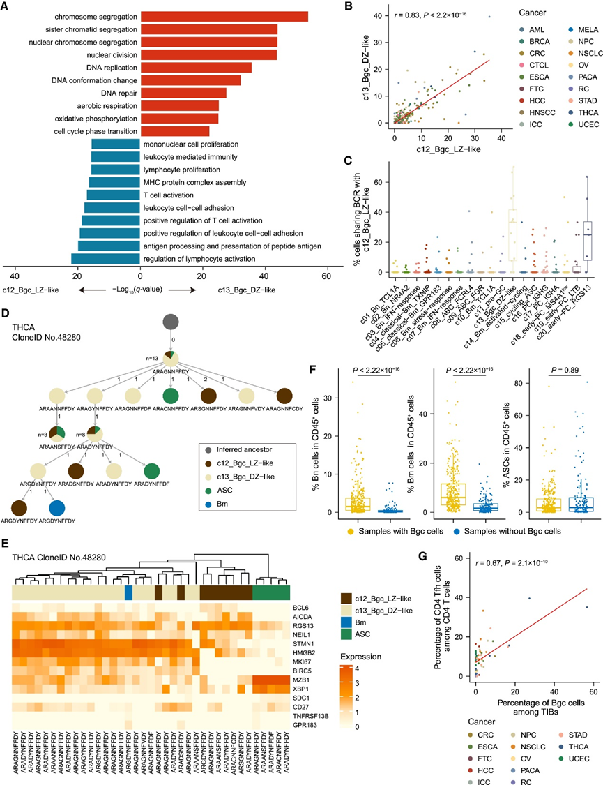 (a) 肿瘤内 c12 和 c13 Bgc 细胞中富集的通路。(b) 未经治疗的肿瘤样本(B 细胞 > 50)中 c12 和 c13 Bgc 细胞丰度之间的 Pearson 相关性。(c)每个 B 细胞亚群中与肿瘤内 c12_Bgc_LZ 样细胞共有 BCR 的细胞比例。 (d) THCA 肿瘤的 TIB 代表性谱系树。(e) 热图显示 (D) 中谱系树中 B 细胞中 B 细胞主要谱系标志物的表达。(f)箱线图比较了含有和不含有 Bgc 细胞的肿瘤中 Bn 细胞、Bm 细胞和 ASC 的丰度。 (g) 肿瘤中 Bgc 细胞和 CD4 Tfh 细胞丰度之间的 Pearson 相关性。