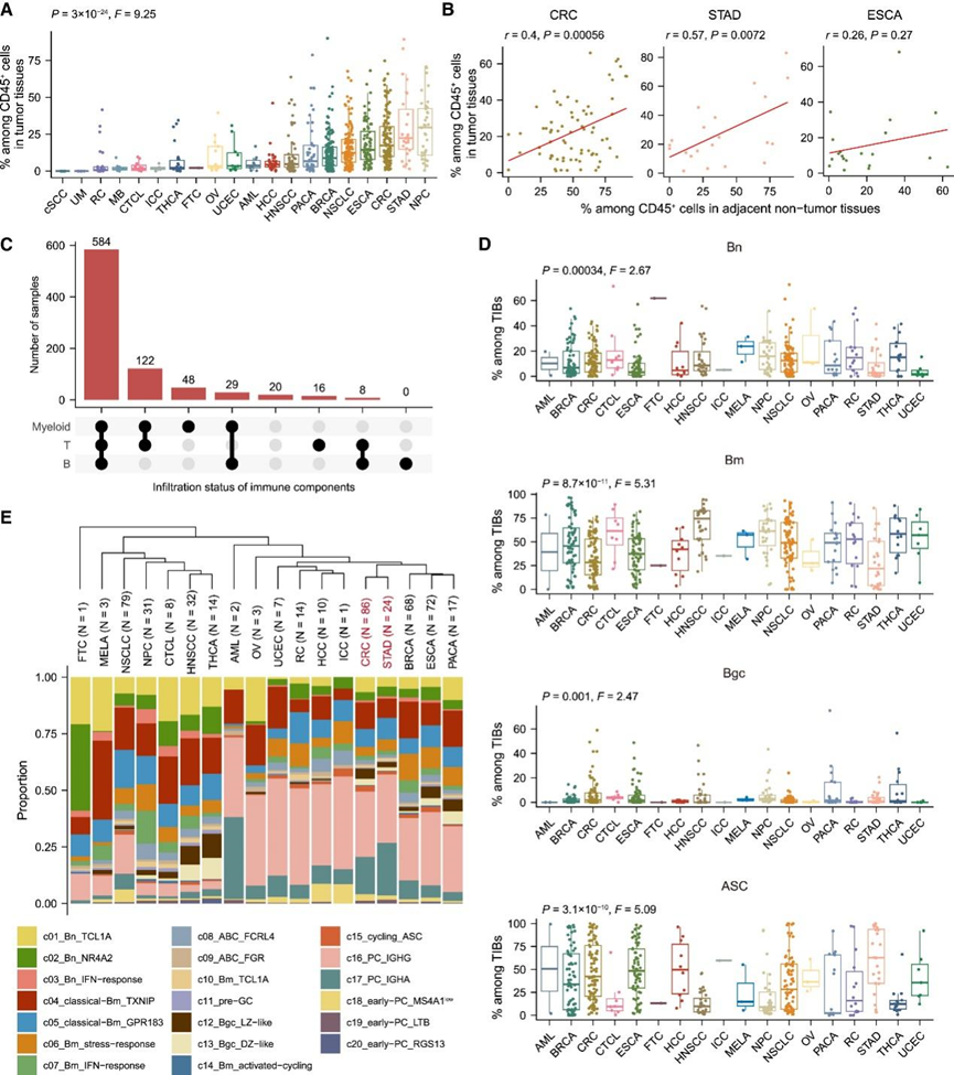 癌症免疫疗法的成功启发了人们对整体肿瘤生态系统的深入探索,特别是肿瘤微环境 (TME) 的免疫方面。肿瘤浸润 T 细胞和髓样细胞的功能状态和异质性的综合图谱促进了多种新的治疗策略产生。然而,只有部分患者获得持久的反应,并且不同癌症类型之间的反应率差距很大。因此有必要在泛癌症水平上全面了解 TME,以充分挖掘人类癌症免疫监视的潜力。B 细胞作为免疫系统的核心组成部分,在免疫中发挥重要作用,但它们受到的关注较少,肿瘤浸润 B 细胞 (TIB) 的组成和功能异质性尚未系统地研究。
