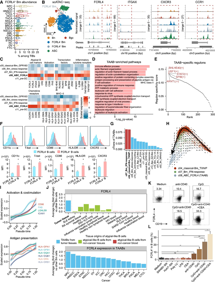 (a) 不同癌症类型的 TIB 中 FCRL4+ Bm 细胞的比例。 (b) t 分布随机邻域嵌入 (t-SNE) 图显示 BRCA 患者 scATAC-seq 数据集中的 B 细胞注释(左)。ATAC-seq 轨迹显示四个 TAAB 标记基因位点的染色质可及性(右)。(c) 与肿瘤中其他组织富集的 Bm 亚群相比,TAAB 中差异表达的选定基因的表达。(d)通路分析。(e)TAAB 特异性调控子按调控子特异性得分降序排列。(f) 流式细胞分析。(g) TIB 子集与 TAAB 的成对转换指数 (pTrans),其中突出显示了前两个子集。 (h) RNA 速率分析。 (i) 选定基因表达与伪时间之间的关系。(J) ABC 与其他 Bm 细胞之间FCRL4表达变化。(K)FCRL4 + B 细胞诱导实验。 (L) 在不同条件下培养的总 B 细胞中FCRL4+ B 细胞的百分比。