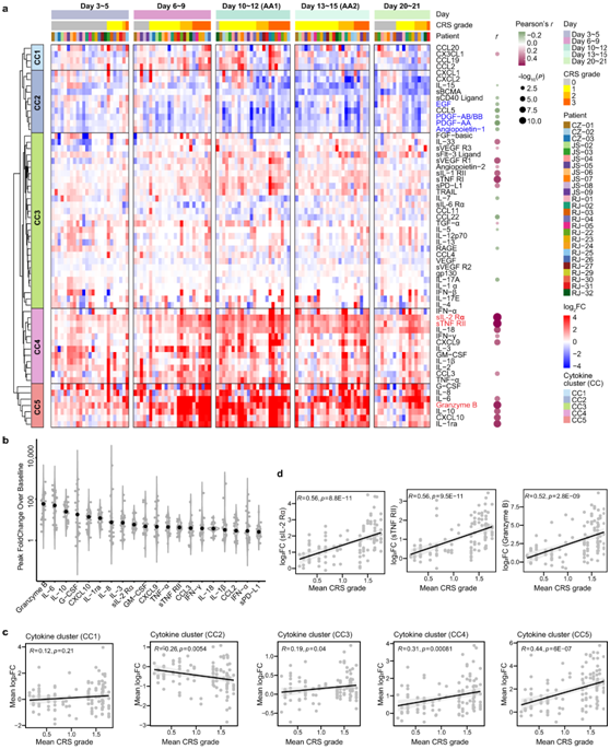 (a) 热图展示了 26 名患者在 CAR-T 治疗后不同时间段(X 轴)内 61 种细胞因子(Y轴)的动态变化。(b) 图中显示了排名前 20 名的每种细胞因子的中位峰值 FC。 (c-d) 散点图显示平均 CRS 等级与细胞因子平均 log2 FC 变化之间的相关性,以及平均 CRS 等级与细胞因子水平之间的相关性。