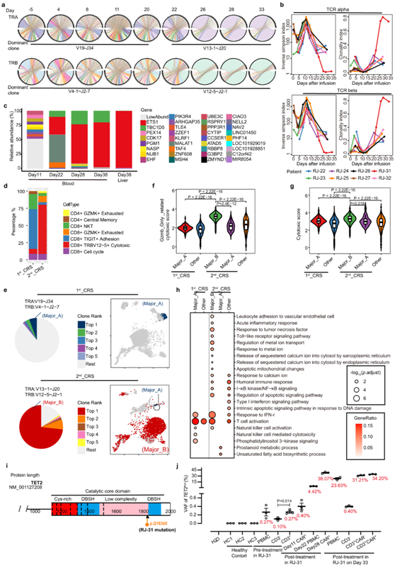 (a) 圆形图显示 TCR α 链 (TRA) 和 β 链 (TRB) 的遗传 VDJ 重排类型。(b) Cilta-cel 治疗后 8 名患者的 TCR 多样性(逆辛普森指数)和 T 细胞克隆扩增(克隆性指数)。(c) 整合位点的丰度标志着RJ-31血液和肝脏中的CAR-T克隆。 (d) 分别在第一次和第二次 CRS 攻击时纯化的 CAR-T 群体中 CD4 或 CD8 亚型的比例。 (e) 饼图显示了纯化的 CAR-T 群体中排名前 5 的克隆的频率。(f-g) 小提琴图显示了两个 CRS 中分别源自 CAR-T 的两个优势克隆的细胞毒性免疫表型。 (h)GO分析 (i) TET2 催化结构域图。(j) RJ31 中TET2 的变异等位基因分数 (VAF) 的统计图.