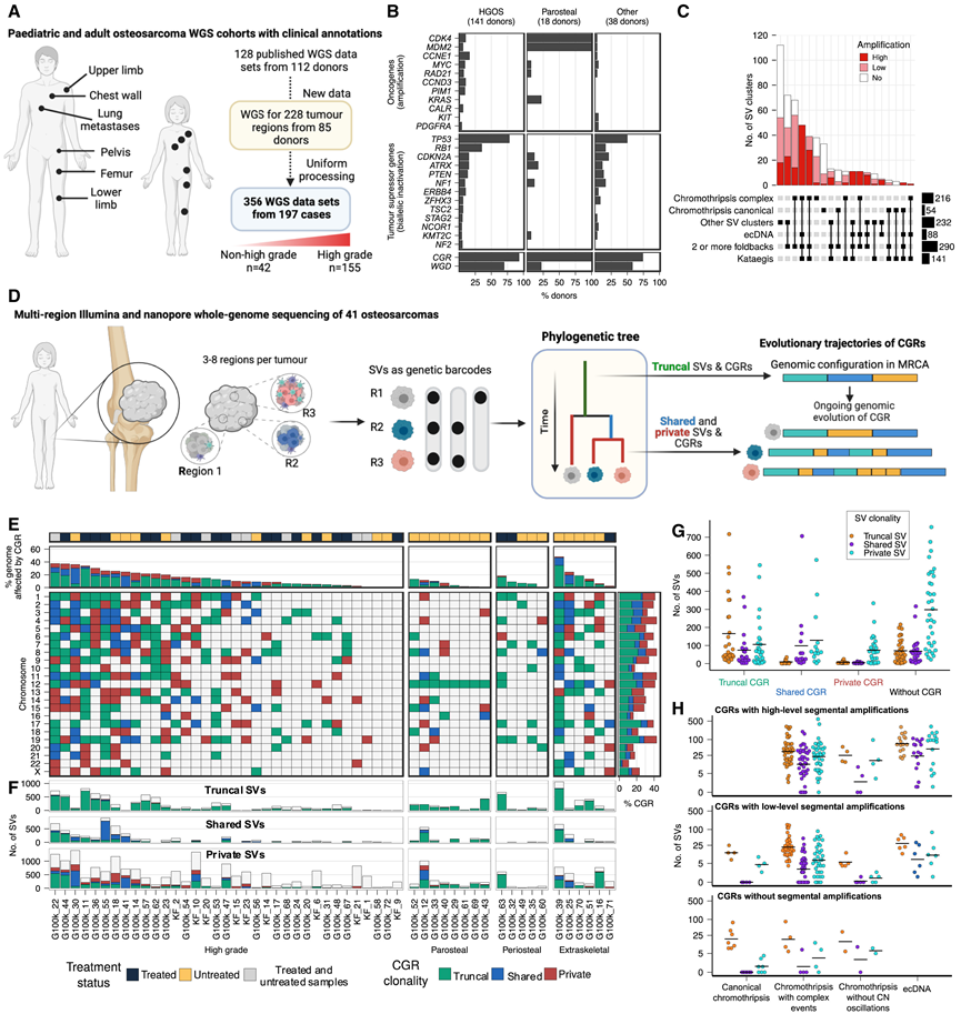 研究团队对来自 197 位患者的 356 个原发性和转移性骨肉瘤样本进行了统一的 WGS 数据处理,包括 128 个肿瘤样本的已发表数据(图1 A),该数据包括85 位骨肉瘤患者的 228 个肿瘤区域的高深度多区域 Illumina WGS(每个肿瘤 2-8 个区域;中位数 4 个区域),以及来自原发性骨肉瘤不常见组织学变体的 13 个样本。最终数据集包括 246 例高级别传统 (HGOS)、43 例骨旁骨肉瘤、15 例骨膜骨肉瘤、9 例低级别中心骨肉瘤和 30 例软组织骨外骨肉瘤,以及 13 例富含破骨细胞的原发性高级别骨肉瘤。此外,他们对 6 例 HGOS 病例的 23 个区域进行了多区域纳米孔 WGS分析,并对另外 12 例 HGOS 病例进行了单区域纳米孔 WGS分析。患者平均年龄为 30 岁(范围 4-89 岁;40% 的患者年龄在 18 岁以下),40% 的样本来自用 MAP 化疗方案(甲氨蝶呤、阿霉素和顺铂)或其变体治疗的肿瘤。
