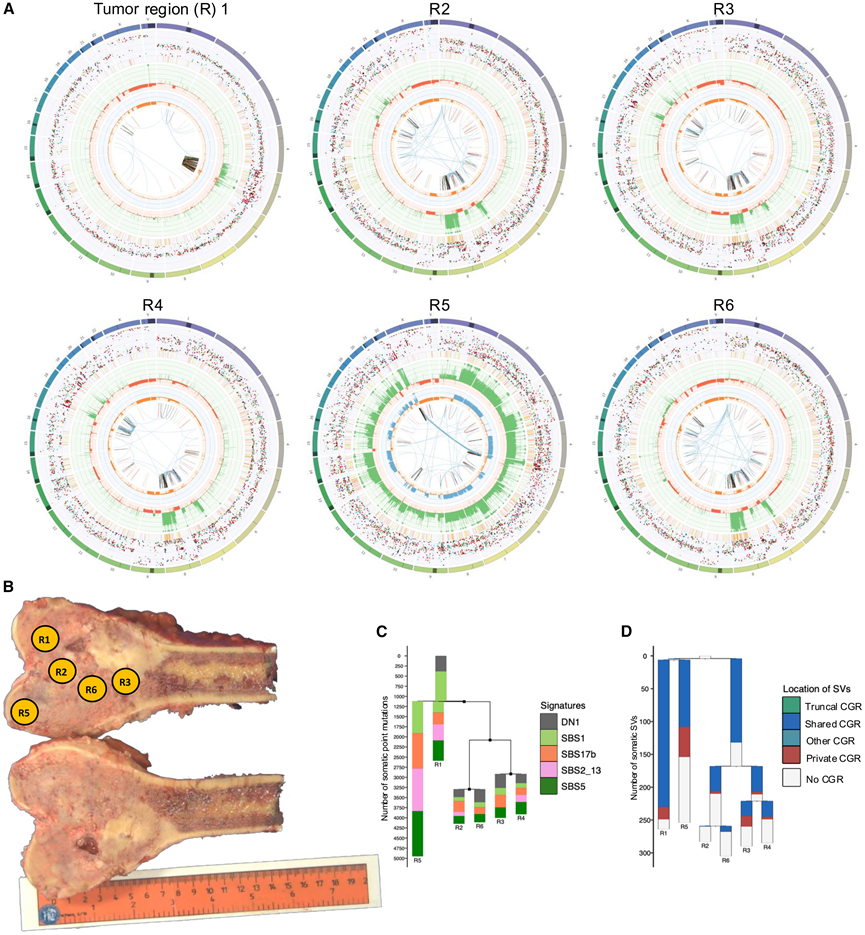 (A) Circos 图表示在病例 G100k_41 的六个肿瘤区域 (R) 的 WGS 数据中检测到的体细胞畸变状况。(B) 病例 G100k_41 的原发性肿瘤宏观图像。(C-D) 使用在病例 G100k_41 的多区域 WGS 数据中检测到的体细胞 SNV 或 SV 构建的系统发育树。