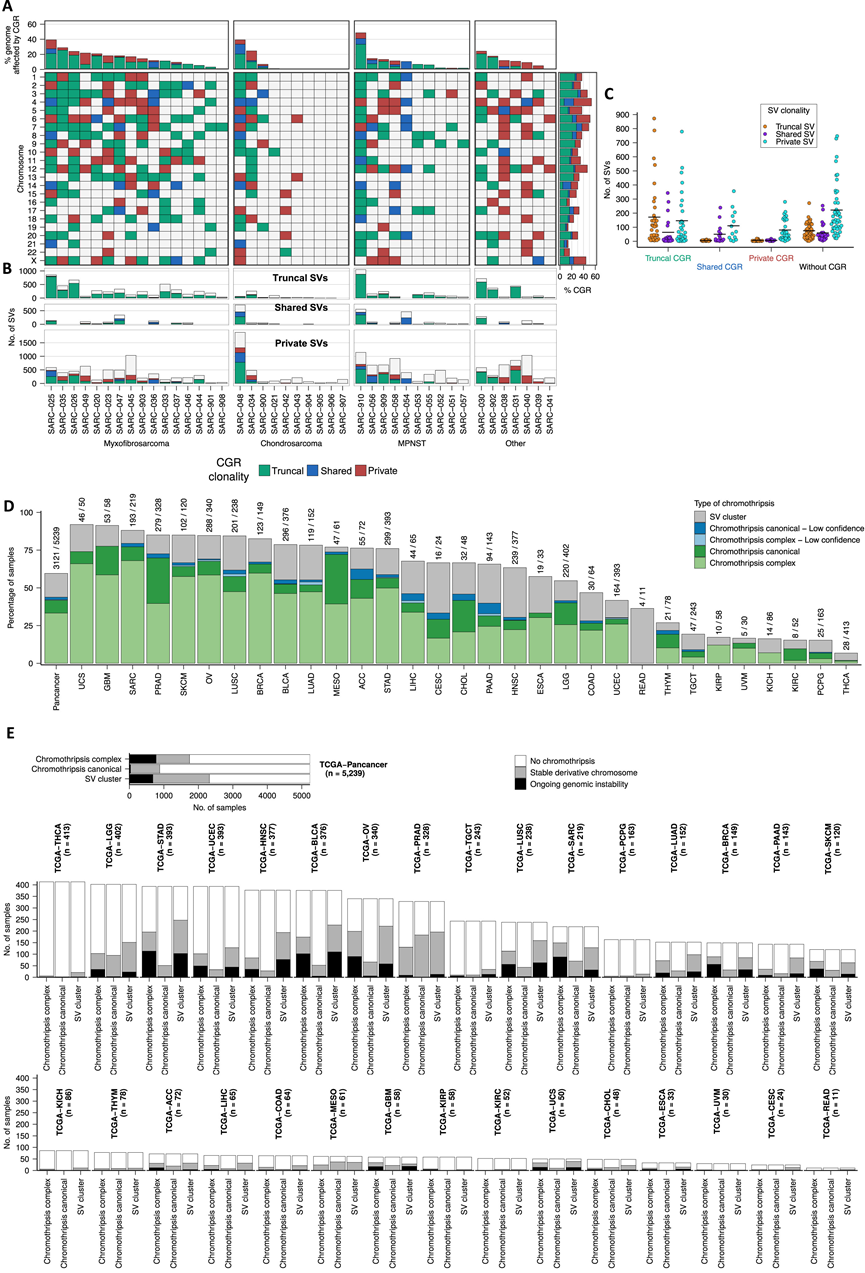 (A) CGR 在常染色体和 X 染色体上的分布。(B) SV 数量分析。(C) 映射到受CGR 影响的区域以及受 CGR 影响的SV数量。(D) 涵盖 31 种癌症类型的 5239 个 TCGA 肿瘤的染色体碎裂和复杂基因组重排的发生率。(E) 涵盖 31 种癌症类型的 5239 个 TCGA 肿瘤的染色体碎裂和复杂基因组重排(包括低置信事件)的发生率。