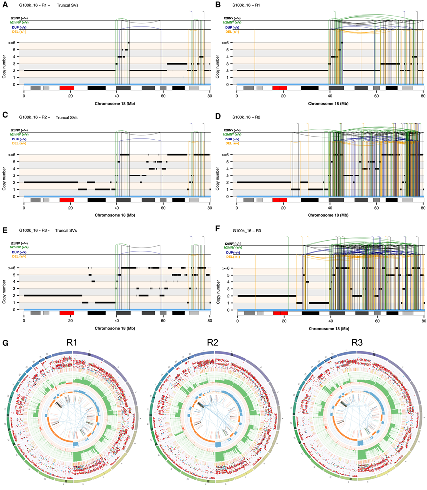 (A-F) 使用病例 G100k_16 的肿瘤区域 R1、R2 和 R3 的体细胞 SV 和拷贝数信息计算的 18 号染色体重排图谱。(G) Circos 图表示在区域 R1、R2 和 R3 的 WGS 数据中检测到的体细胞畸变状况。