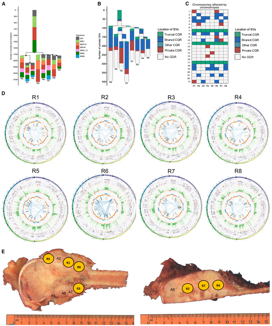 (A-B) 使用在病例 G100k_30 的多区域 WGS 数据中检测到的体细胞 SNV(A)或 SV(B)构建的系统发育树。(C) CGR 在染色体和肿瘤区域的分布。(D) Circos 图表示在病例 G100k_30 的八个肿瘤区域 (R) 的 WGS 数据中检测到的体细胞畸变状况。(E) 病例 G100k_30 的原发性肿瘤宏观图像。