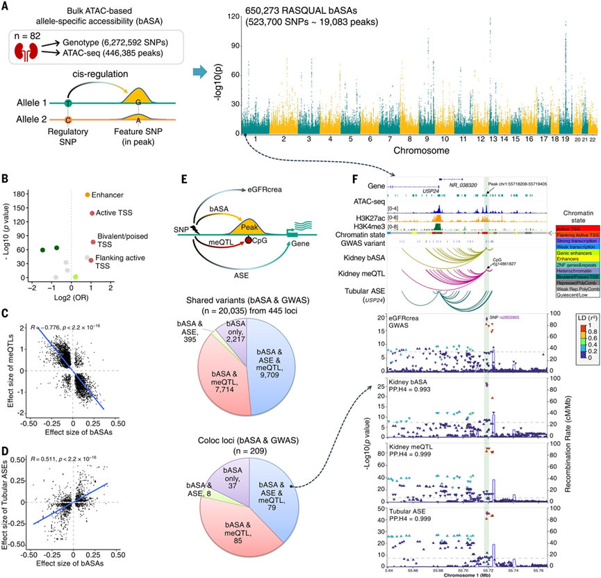(A) 人类肾脏中 bASA 分析的分析工作流程和曼哈顿图。 (B) 使用组蛋白修饰估计的肾脏染色质状态中 bASA 峰的富集。(C) 肾脏 bASA(x 轴)和 meQTL(y 轴)之间效应大小的关联。(D) 肾脏 bASA(x轴)和管状 ASE(y轴)之间效应大小的关联。(E) 使用bASA结合 ASE 和 meQTL 对 GWAS 变体和基因座进行优先级排序。(F) USP24基因座中 eGFRcrea GWAS、肾脏 bASA、meQTL 和小管 ASE 的调控元件和位点图谱。