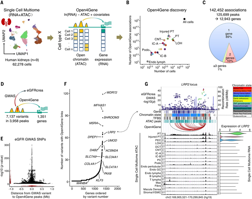 (A) 人类肾细胞中单细胞核多组学 (RNA + ATAC) 和 Open4Gene 分析的分析工作流程。(B) 每种细胞类型中鉴定出的细胞数量(x轴)和 Open4Gene 链接(y轴)。(C) 针对不同基因和多个基因的开放染色质峰的分数。(D) 使用 Open4Gene 链接对 GWAS 变体的目标基因进行优先级排序。(E) eGFRcrea GWAS 强度(y轴)和 GWAS 变体到 Open4Gene 峰的距离(x轴)。(F) 使用 Open4Gene 链接为每个基因鉴定出的 GWAS 变体数量。(G) eGFRcrea GWAS、Open4Gene 链接和LRP2 基因座中的调控元件的轨迹缩放。