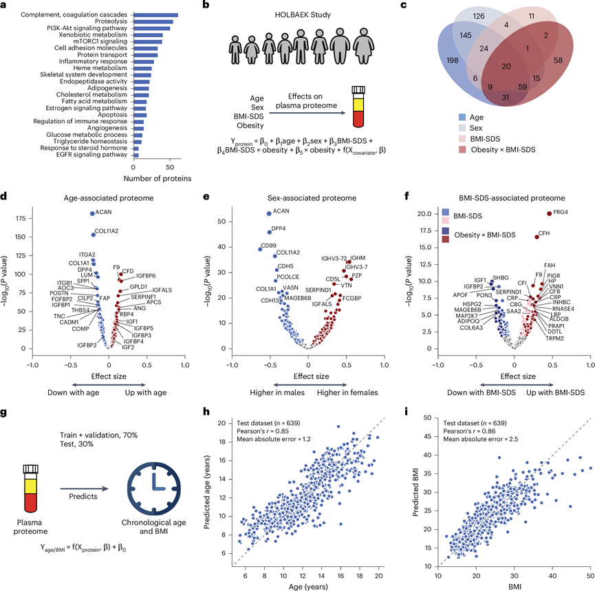 (a) 已鉴定蛋白质所参与的生物过程。(b) 使用各种因素对蛋白质水平进行线性建模的示意图。(c) 与年龄、性别、BMI-SDS 以及肥胖状态与 BMI-SDS 之间的相互作用项相关的蛋白质数量。(d-f) 火山图显示与年龄、性别和 BMI-SDS相关的蛋白质,突出显示密切相关的蛋白质。(g) 使用血浆蛋白质组对年龄和 BMI 进行线性建模的示意图。(h-i) 在测试集中预测年龄和 BMI。显示了预测值和实际值之间的 Pearson 相关系数。
