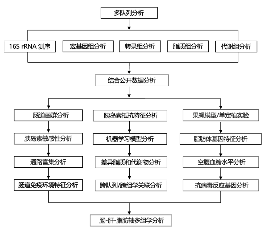 译名:多项研究中的肠-肝-脂肪轴多组学揭示了肠道微生物群和抗病毒反应与全身葡萄糖代谢之间的一致联系