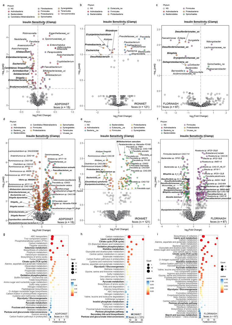 (a-f) ADIPOINST、IRONMET和 FLORINASH 研究中与胰岛素敏感性(高胰岛素-正常血糖钳)相关的差异微生物属和种的火山图。(g-i) KEGG 通路过度表达分析的点图。