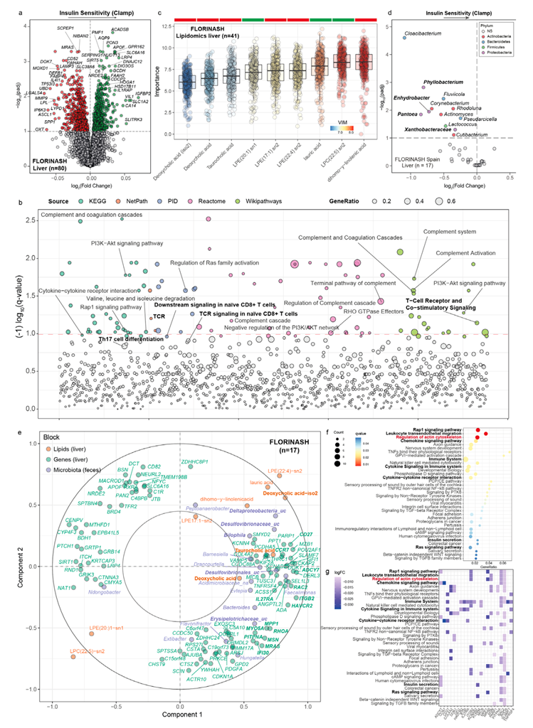 (a) 差异表达基因的火山图。(b) 通过通路过度表达分析确定的与肝脏胰岛素敏感性显著相关的通路的曼哈顿图。(c) 与 FLORINASH 队列肝脏中胰岛素敏感性相关的脂质的标准化变量重要性度量的箱线图。(d) 差异微生物属的火山图。(e) 整合 FLORINASH 队列中与胰岛素敏感性相关的肝脏脂质、肝脏基因和粪便微生物种类的相关圆图。(f-g) 显著富集通路的点图和参与这些通路的基因热图。