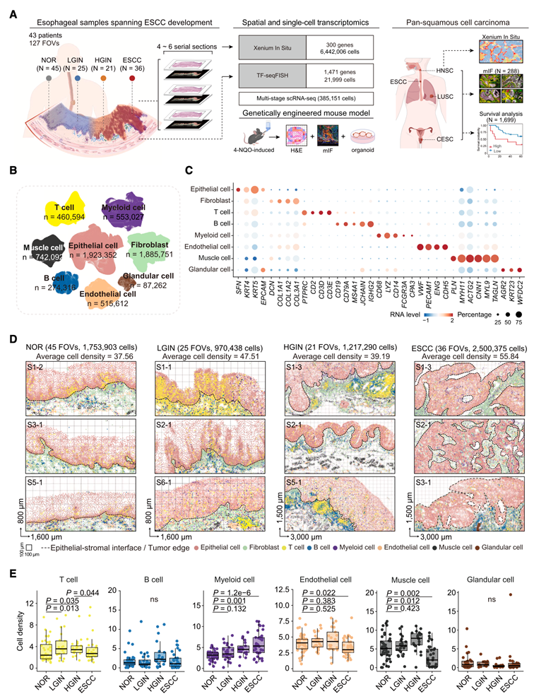 (A) 本研究ESCC的时空转录组学分析示意图。(B) UMAP图显示了ESCC肿瘤发生过程中样本中的细胞群。(C) 点图显示不同细胞群中标记基因的标准化RNA水平。(D) 代表性FOV的空间转录组图谱。(E) 箱形图显示不同细胞群的平均密度。