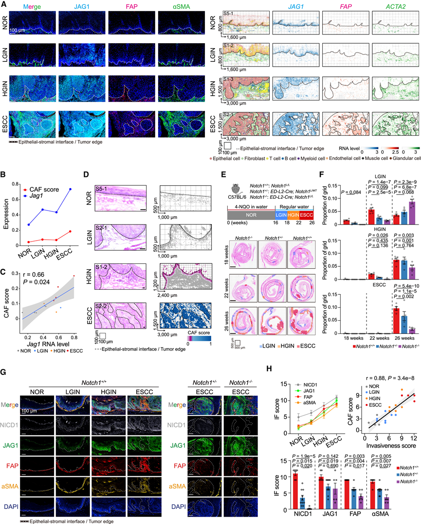 (A) 不同阶段的 JAG1 和 CAF 激活标记物 FAP 和 αSMA 的多重免疫荧光分析(左)和空间转录组图(右)。(B) 线图显示了NOR、LGIN、HGIN和ESCC阶段的Jag1 RNA 水平和 CAF 评分趋势。(C) 来自小鼠 scRNA-seq 数据的Jag1水平与 CAF 评分的 Spearman 相关性。(D) 代表性 NOR、LGIN、HGIN 和 ESCC 区域的空间图。(E) 食管上皮特异性Notch1条件性敲除的基因工程小鼠中食管癌前病变和 ESCC 的诱发图表(上)和 H&E 图像(下)。(F) 条形图显示 LGIN、HGIN 和 ESCC 的网格比例(按基因型划分)。(G) 在不同阶段的小鼠食管样本中对 NICD、JAG1 和 CAF 激活标志物 FAP 和 αSMA 进行多重免疫荧光分析。(H) 免疫荧光 (IF) 评分以及增殖和 CAF 评分的 Spearman 相关性。
