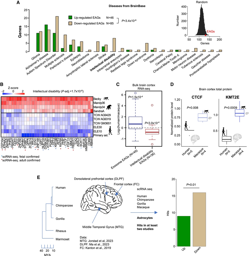 (A) 下调的 EAG 比激活的 EAG 与脑部疾病的关联性更高。(B) iAstrocytes 和胎儿星形胶质细胞中与 ID 相关的下调 EAG 的表达热图。(C) 与猕猴大脑皮层相比,外泌体相关基因在人类中表现出普遍的转录上调。(D) 与猕猴大脑皮层组织相比,人类 ID 相关基因 CTCF 和 KMT2E(分别为左和右)的蛋白质水平降低。(E) 在人类成人星形胶质细胞中,ID 相关基因下调的频率高于上调。