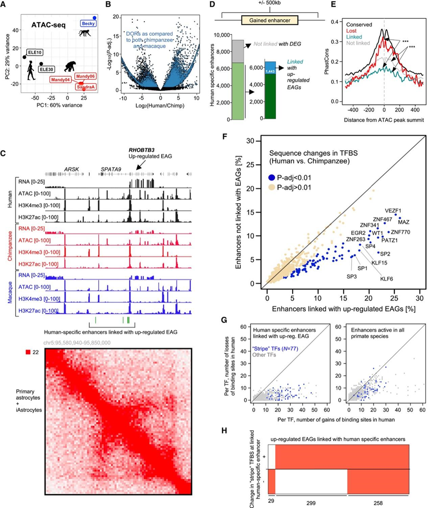 (A) 主成分分析 (PCA) 揭示了人类、黑猩猩和恒河猴 iAstrocyte 染色质开放性图谱按物种的聚类情况。(B) 灵长类动物 iAstrocytes 的差异开放性。(C) 编码上调 EAG RHOBTB3 基因座的基因表达、染色质活性和结构。(D) 人类 iAstrocytes 中获得的大多数增强子可以与进化过程中表达变化的基因相关联。(E) 在常见、丢失和获得的 ATAC 峰顶周围的基因组间隔中的 PhastCons 得分。(F) 在预测的 TF 结合位点 (TFBS) 中发生变化的元素的每个 TF 频率在人类特异性链接和不链接增强子之间有所不同。(G) 连接增强子的 DNA 序列的进化变化导致 TFBS 的增加而不是减少。(H) 大多数上调的 EAG 位于人类谱系中获得的增强子的 500 kb 范围内,该增强子的特点是 (F) 中鉴定的 77 个TF 之一的基序发生了进化变化。