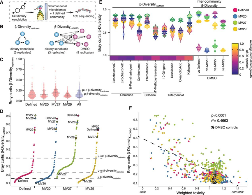 (A-B)实验设计示意图。(C) 在每个群落中对 140 种饮食外来生物进行 β-多样性分析。 (D) 指数图显示了用 140 种膳食异生物质处理的每个群落的 β 多样性与 DMSO 的关系。(E) 十种饮食外来生物的小提琴图,重塑了所有四个群落。还显示了每对 DMSO 处理群落的群落间 β多样性。(F) β多样性与毒性之间的相关性。