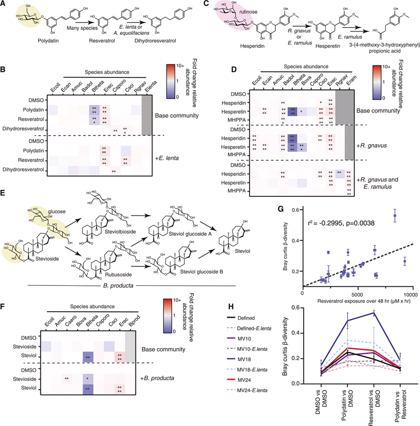 (A-F)不同化合物引起的群落重塑。(G) β-多样性与 DMSO和白藜芦醇暴露之间的相关性。(H) 添加E. lenta可调节群落重塑。