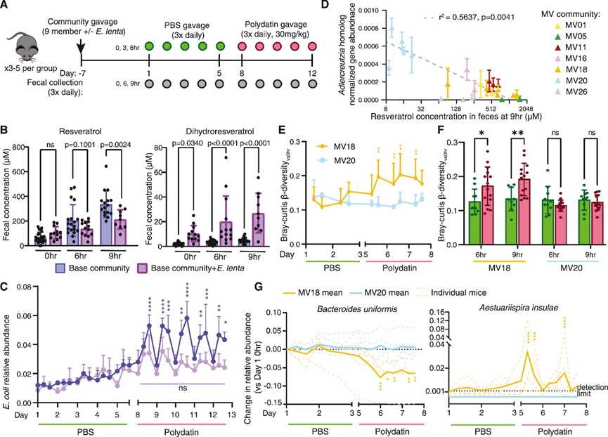 在对照阶段,有E. lenta的群落组成保持稳定,但在进行白藜芦醇苷(polydatin)处理期间,缺少E. lenta的群落表现出每日的扰动。在群落扰动期间,E. coli(对白藜芦醇的生长抑制具有抗性)在接受白藜芦醇苷处理后,其相对和绝对丰度(通过菌落形成单位 [CFU] 测量)每天增加3到4倍,并在白藜芦醇通过肠道后,次日早晨恢复到基线水平(图7C)。与E. lenta将白藜芦醇解毒为二氢白藜芦醇的能力一致,添加E. lenta可保护群落(包括大肠杆菌)免受白藜芦醇苷的破坏(图7C)。