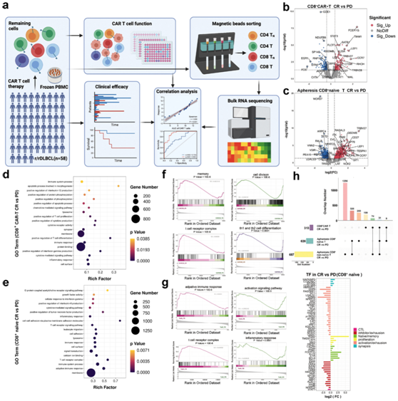 (a) 验证bulk RNA 测序实验设计的示意图。(b-c) 比较耐药患者和 DR 患者,火山图显示输注的 CD8+ CAR-T 细胞和单采 CD8 +幼稚 T 细胞中基因表达的差异倍数。(d-e)GO分析。(f-g) GSEA分析。 (h) 维恩图显示了各种TF基因的交集。