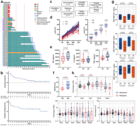 在本研究中,缓解患者包括CAR-T细胞输注后达到CR或部分缓解(PR)的患者,持久反应(DR)或复发的定义是根据这些患者在细胞治疗后1年内是否出现疾病复发(图1c)。