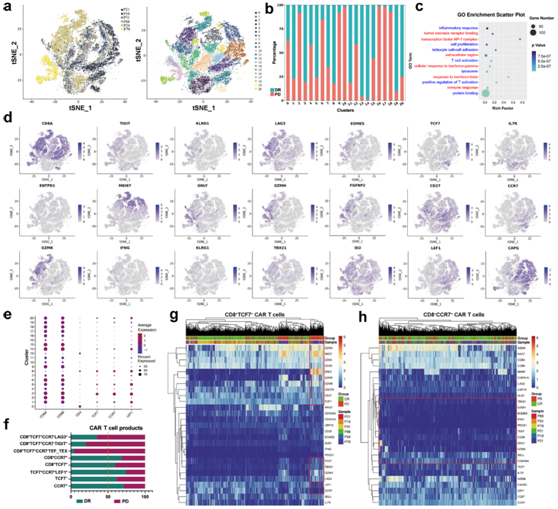 (a) tSNE 可视化。(b) 柱状图显示来自DR和耐药患者的细胞在聚类中的分布。(c)GO分析。 (d) 所选基因的表达覆盖在 tSNE 图上。 (e) 显示每个聚类的 T 细胞记忆相关标记的表达。 (f) DR 和耐药患者中具有不同基因表达特征的细胞比例的定量。(g-h) 热图显示了从 DR 患者获得的CD8 + TCF7 + CAR-T 细胞和从 PD 患者获得的 CD8 + CCR7 + CAR-T 细胞之间差异表达的基因。