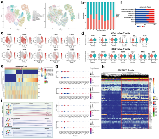 (a) t-SNE可视化。(b) 条形图显示 DR 和 PD 患者的细胞在聚类中的分布。 (c) 所选基因的表达覆盖在 tSNE 图上。(d) 小提琴图显示 CD4 +幼稚(上)和 CD8 +幼稚(下)T 细胞群中选定的基因表达。(e) 热图显示了从 DR 患者和从 PD 患者获得的单采 T 细胞之间差异表达的基因。 (f) DR 和 PD 患者中具有不同基因表达特征的单采 T 细胞比例的量化。 (g) 不同细胞的 T 细胞记忆相关基因和激活/抑制相关标记的表达。(h) 热图显示来自 DR 和耐药患者的单采细胞的CD8 + TCF7 + T 细胞之间的差异表达基因。(i) DR 和耐药患者之间输注的 CAR-T 细胞和单采 T 细胞的功能/分子差异的表征。
