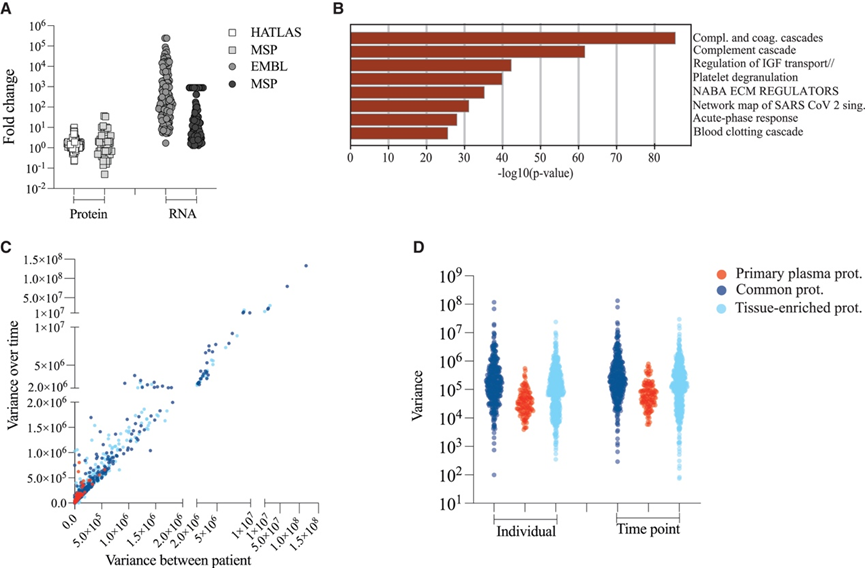 由于主要血浆蛋白是主动分泌到血浆中的,而不是细胞坏死或正常周转的结果,他们推测它们比组织富集蛋白受到更严格的稳态控制。为了验证这一点,他们使用了上述健康志愿者的时间分辨血浆样本。在这个队列中,他们在 5 周内每周从 10 个个体中采集 5 个样本,并使用 DIA-MS 进行分析。根据上述定义,他们分析了所有个体和所有不同时间点的定量组织富集蛋白、共有组织蛋白和主要血浆蛋白的方差。该分析表明,不同个体之间的差异高于单个个体内的差异,表明血浆蛋白质组的个体差异随时间相对稳定(图 3C-D)。此外,与共有蛋白和组织富集蛋白相比,主要血浆蛋白的蛋白质水平方差较低,表明该蛋白质组受到更严格的稳态控制。总的来说,以数据为驱动的血浆原蛋白定义有助于更好地监测血浆中的组织来源蛋白。此外,这些结果表明,在正常生理条件下,血浆中可检测到的几种组织富集蛋白的个体间变异性高于血浆原蛋白。