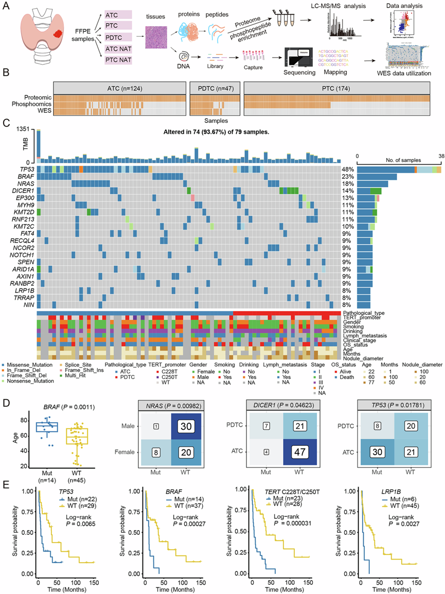 (A) 甲状腺癌分子谱分析的实验流程和样本类型。(B) 三种分子图谱(WES、蛋白质组学和磷酸化蛋白质组学)中检测到的样本概览。(C) 51 例 ATC 和 28 例 PDTC 患者的突变情况及相关临床信息。(D) 51例 ATC 和 28 例 PDTC 患者的病理特征与基因突变之间的关系。(E) Kaplan-Meier 曲线显示基因突变与患者生存之间的关系。