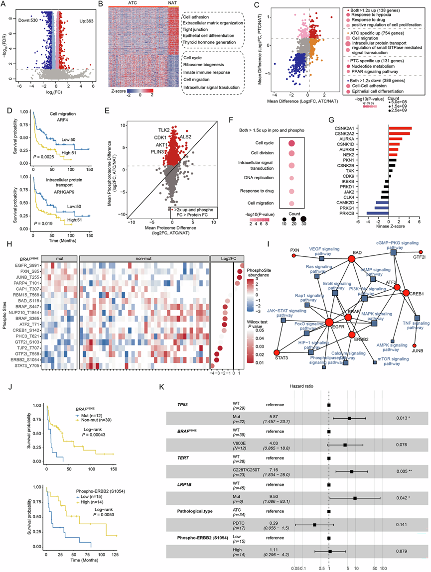 (A) 火山图显示ATC 和NAT 样本之间的差异蛋白质丰度。(B) 热图显示ATC 和NAT 样本之间显著差异蛋白质的丰度。(C) 散点图显示 与 NAT样本相比,ATC和 PTC中常见和特定蛋白质的变化。(D) Kaplan-Meier 曲线显示 ARF4 和 ARHGAP9 蛋白质丰度与患者总生存期 (OS) 之间的关系。(E) 散点图显示,与 NAT 样本相比,ATC 中蛋白质丰度变化和磷酸化丰度变化之间的关系。(F)气泡图显示,在磷酸化和蛋白质水平上,差异倍数大于 1.5 的蛋白质的富集通路显著增加。(G) 与NAT样本相比,ATC 中的激酶活性发生显著变化。(H) 潜在底物磷酸化丰度的变化。(I) 网络图显示了受BRAF V600E突变影响的潜在底物与其参与的通路之间的关系。(J) Kaplan-Meier 曲线分别显示基于BRAF V600E突变和 ERBB2 磷酸化丰度的ATC 患者的 OS。(K) ATC 患者基因突变和磷酸化 ERBB2 的多变量分析。(L) (M) (N)