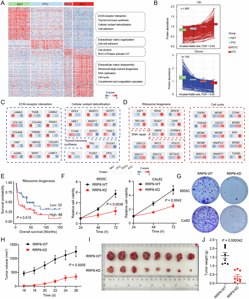 (A) 热图显示与甲状腺癌进展显著相关的蛋白质丰度变化。(B) 箱线图显示随着甲状腺癌的进展,蛋白质的丰度逐渐增加或减少。(C) 随着癌症从正常甲状腺向 PTC(分化表型)、PDTC(低分化表型)和 ATC(去分化表型)发展,显著富集下调蛋白质的通路的蛋白质丰度变化。(D) 随着甲状腺癌的进展,显著富集上调蛋白质的通路的蛋白质丰度变化。(E) Kaplan-Meier 曲线显示基于 ssGSEA 估计的核糖体生物合成通路活性变化与患者总体生存率之间的关系。(F) 别 在8505C(n = 3)和 CAL62(n = 3)中敲低 RRP9 后的细胞活力。(G) 分别在 8505C 和 CAL62 中沉默 RRP9 后的克隆形成实验。(H-J) 肿瘤生长曲线、肿瘤大小和肿瘤重量。
