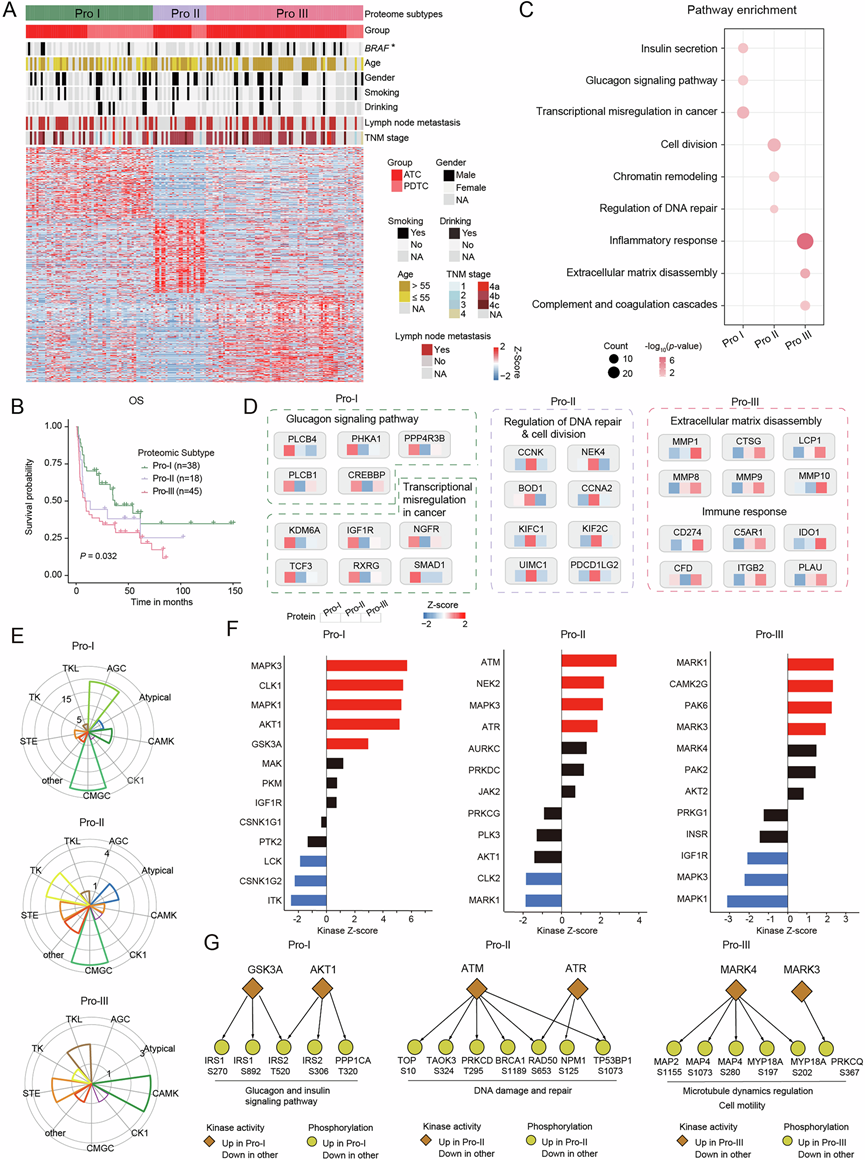 (A) 根据蛋白表达谱将ATC和PDTC患者分为Pro-I、Pro-II、Pro-II三个亚型。下方热图显示各亚型特征蛋白的丰度。上方热图显示三种亚型患者的病理特征。(B) Kaplan -Meier曲线显示不同蛋白亚型患者总生存率存在显著差异。(C) 超几何检验气泡图显示三种亚型差异表达蛋白显著富集的通路。(D) 热图显示三种蛋白亚型关键调控通路下特征蛋白的丰度。(E) 雷达图显示三种蛋白亚型患者激酶家族活性的差异。(F) 条形图显示三种蛋白亚型中关键调控激酶的活性。(G) 三种蛋白亚型中,显著激活的激酶的下游调控底物参与不同的信号通路。