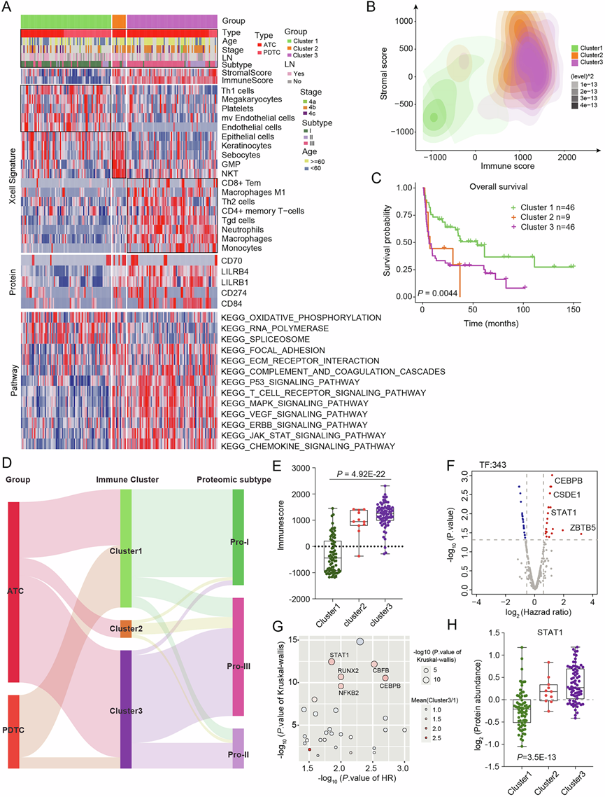 (A) 使用 xCell 计算免疫细胞评分,将 ATC 和 PDTC 患者的免疫亚型分为三种。底部热图显示了三种免疫亚型患者的免疫细胞标志物丰度和通路活性。(B) 三种免疫亚型的免疫评分和基质评分热图。(C) Kaplan -Meier 曲线显示三种免疫亚型患者总生存期的差异。(D) 桑基图显示了 ATC 和 PDTC 样本在免疫亚型和蛋白质组亚型中的组成。(E) 三种免疫亚型的免疫评分箱线图。(F) 343 个转录因子 (TF) 的生存风险评分。(G) 患者生存风险评分方面的转录因子气泡图。(H) 箱线图显示了三种免疫亚型中转录因子 STAT1 的蛋白质丰度差异。